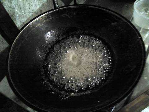 Masukkan gula pasir dalam penggorengan, ratakan dan usahakan gula tidak 'menggunung'. Tuang air asam perlahan disekeliling gula, nyalakan api yang paling kecil, masak tanpa diaduk hingga mengental. Pastikan seluruh gula telah larut dengan cara mencelupkan (bukan mengaduk) sendok dan merasakan apakah masih ada/tidak butir2 gula didalamnya (nasib nggak punya candy thermometer :p) Matikan api.